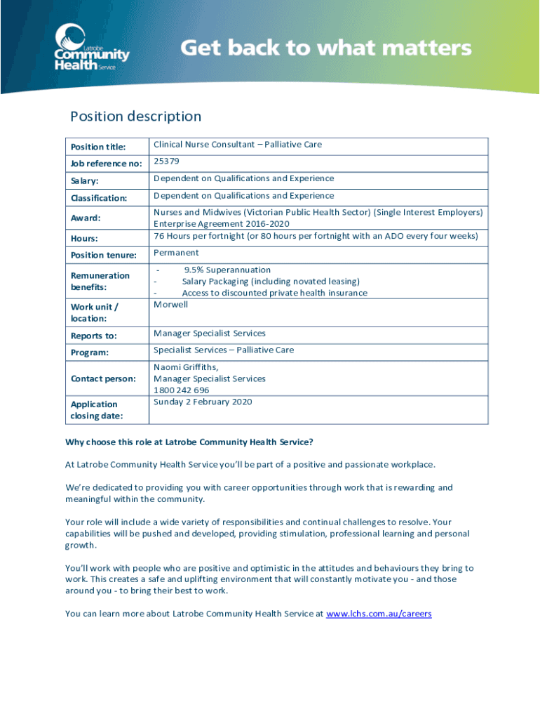 Position description Position title:Clinical Nurse Consultant Palliative Carob reference no:25379Salary:Dependent on Qualifications and ExperienceClassification:Dependent on Qualifications and ExperienceHours:Nurses