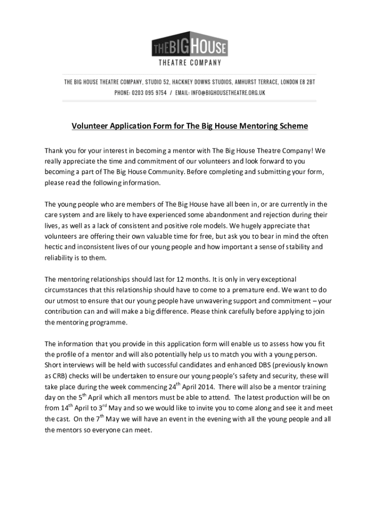 VolunteerApplicationFormforTheBigHouseMentoringScheme ThankyouforyourinterestinbecomingamentorwithTheBigHouseTheatreCompany! We reallyappreciatethetimeandcommitmentofourvolunteersandlookforwardtoyou