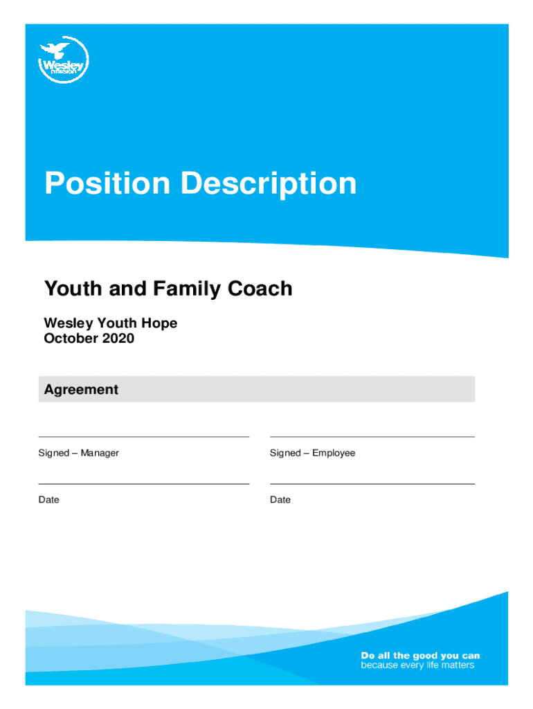 Position DescriptionYouth and Family Coach Wesley Youth Hope October 2020AgreementSigned ManagerSigned EmployeeDateDatePosition Title ManagerManagers initials ___Employees initials ___Page 1 of 8Youth