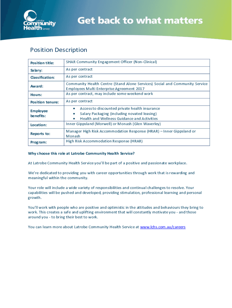 Position Description Position title:STAR Community Engagement Officer (Nonclinical)Salary:As per contractClassification:As per contractors:Community Health Center (Stand-Alone Services) Social and