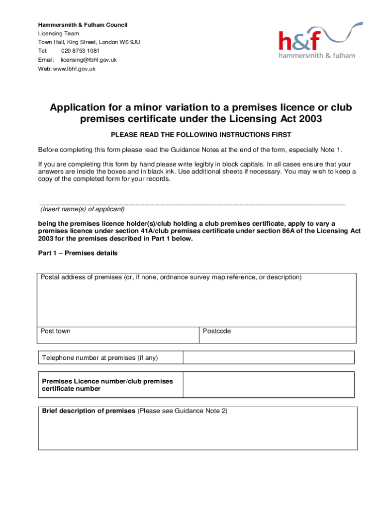 Hammersmith & Fulham Council Licensing Team Town Hall, King Street, London W6 9JU Tel:020 8753 1081Email:licensing@lbhf.gov.web: www.lbhf.gov.ukApplication for a minor variation to a premises license