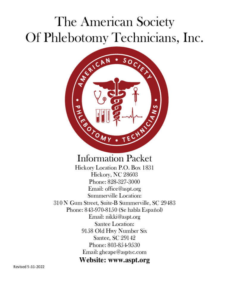 The American Society Of Phlebotomy Technicians, Inc. Information Packet Hickory Location P.O. Box 1831 Hickory, NC 28603 Phone: 8283273000 Email: office@aspt.org Summerville Location: 310 N Gum Street,