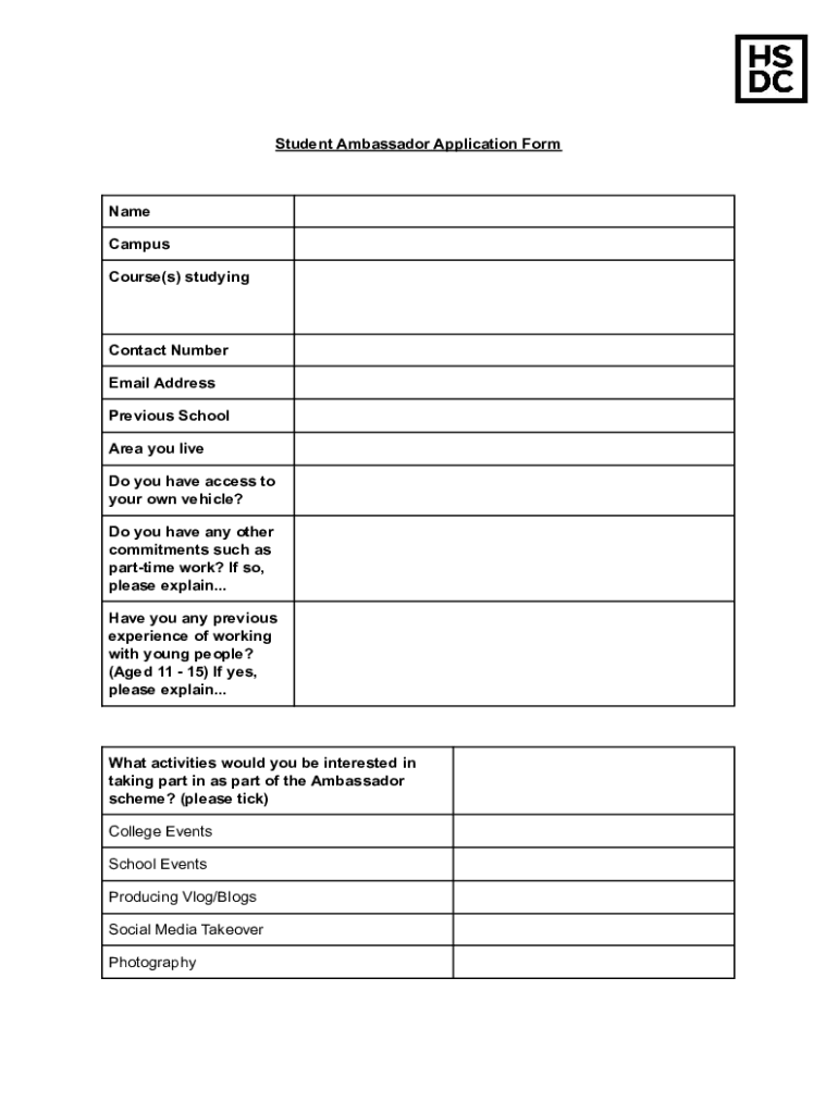 Student Ambassador Application Forename Campus Course(s) studyingContact Number Email Address Previous School Area you live Do you have access to your own vehicle? Do you have any other commitments