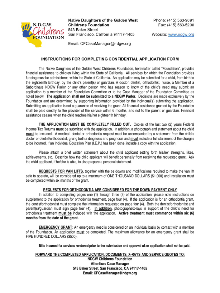 Native Daughters of the Golden West Children's Foundation 543 Baker Street San Francisco, California 941171405Phone: (415) 5639091 Fax: (415) 5635230 Website: www.ndgw.orgEmail: CFCaseManager@ndgw.orgINSTRUCTIONS