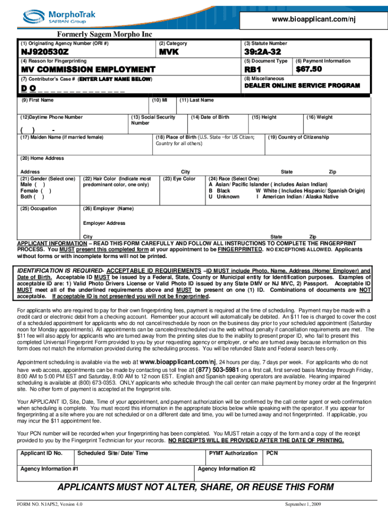 .www.bioapplicant.com/njFormerly SAGEM Morph Inc (1) Originating Agency Number (ORI #)(2) Category(3) Statute NumberNJ920530ZMVK39:2A32(4) Reason for Fingerprinting(5) Document Type(6) Payment Information