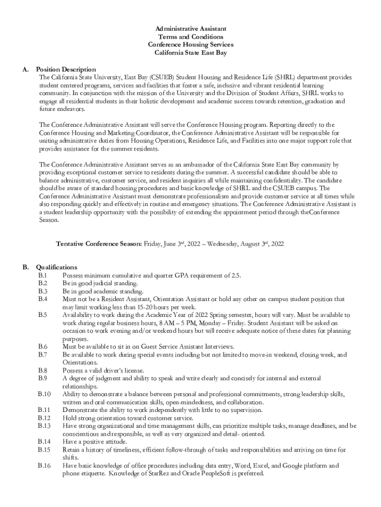 Administrative Assistant Terms and Conditions Conference Housing Services California State East Bay A. Position Description The California State University, East Bay (CLUB) Student Housing and Residence