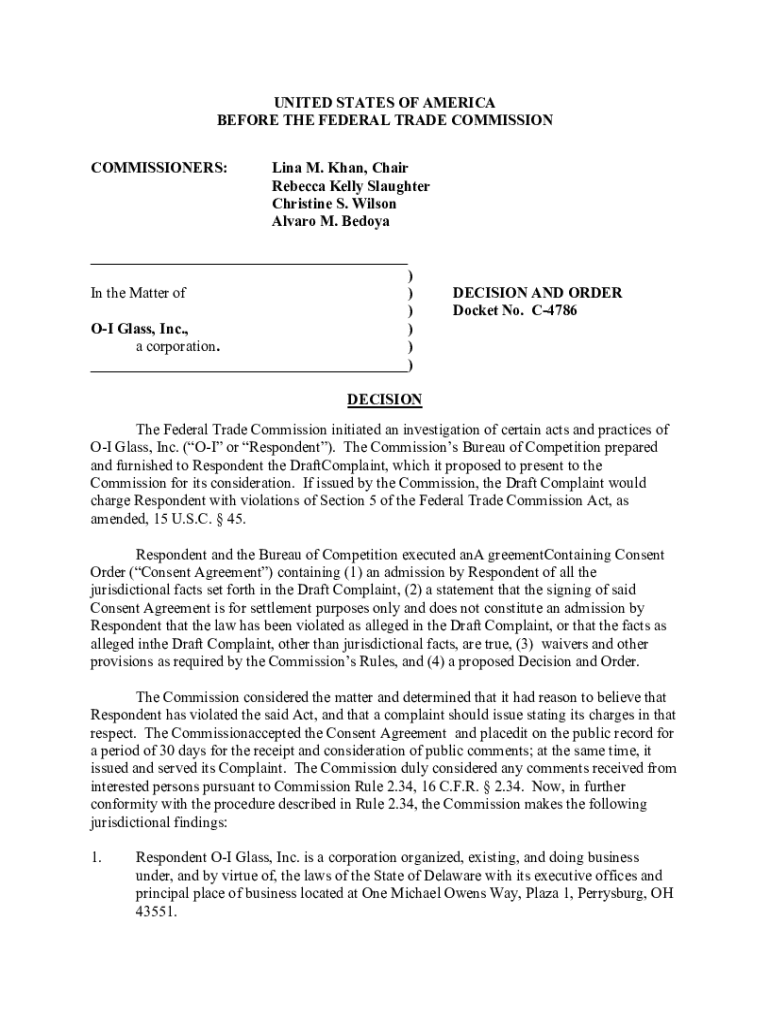 UNITED STATES OF AMERICA BEFORE THE FEDERAL TRADE COMMISSION COMMISSIONERS:Lina M. Khan, Chair Rebecca Kelly Slaughter Christine S. Wilson Alvaro M. Fedora___) In the Matter of)) OI Glass, Inc.,)