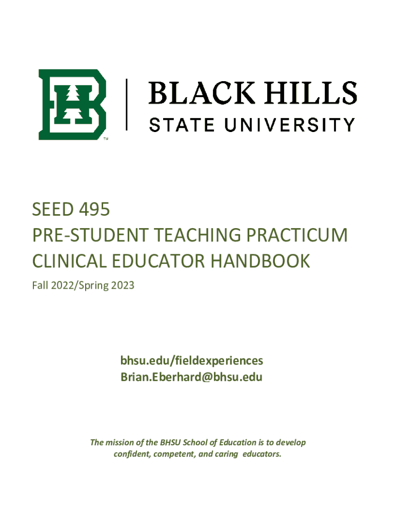 SEED 495 PRESIDENT TEACHING PRACTICUM CLINICAL EDUCATOR HANDBOOK Fall 2022/Spring 2023bhsu.edu/fieldexperiences Brian.Eberhard@bhsu.eduThe mission of the BHS School of Education is to develop confident,