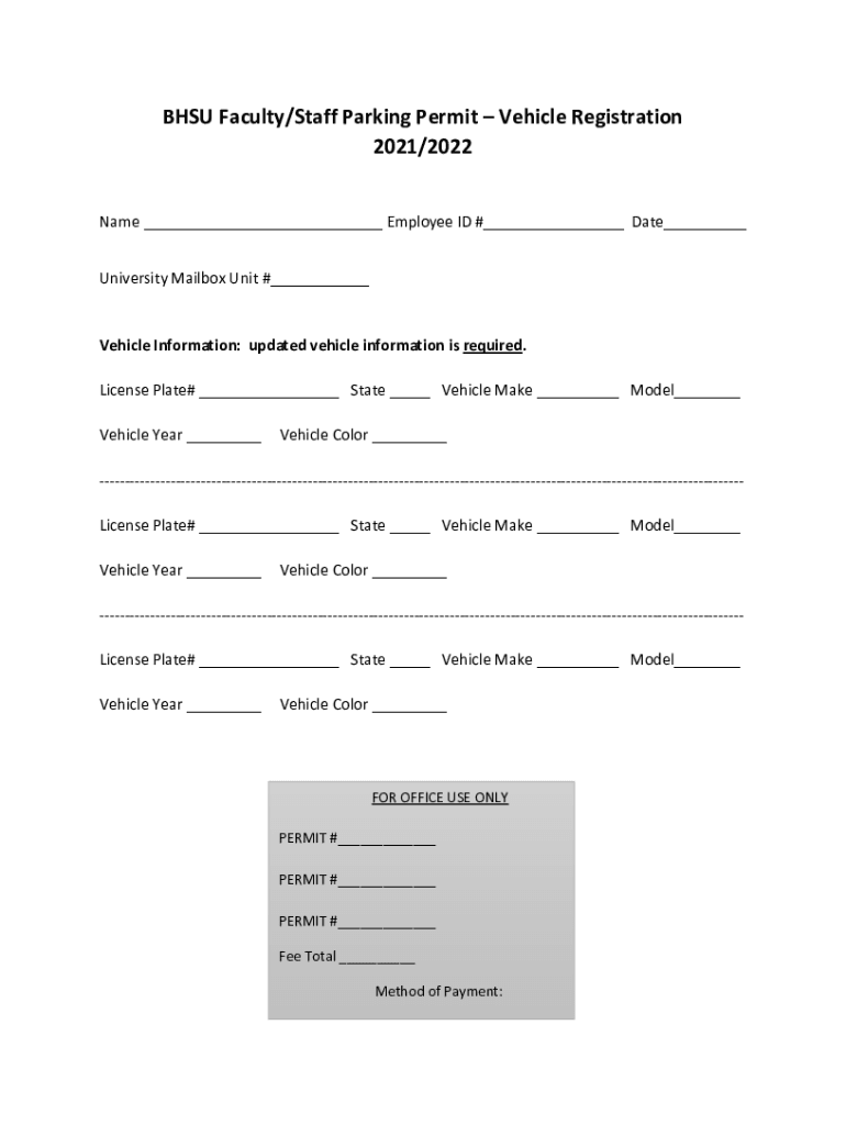 BHS Faculty/Staff Parking Permit Vehicle Registration 2021/2022 Name ___ Employee ID #___ Date___ University Mailbox Unit #___Vehicle Information: updated vehicle information is required. License