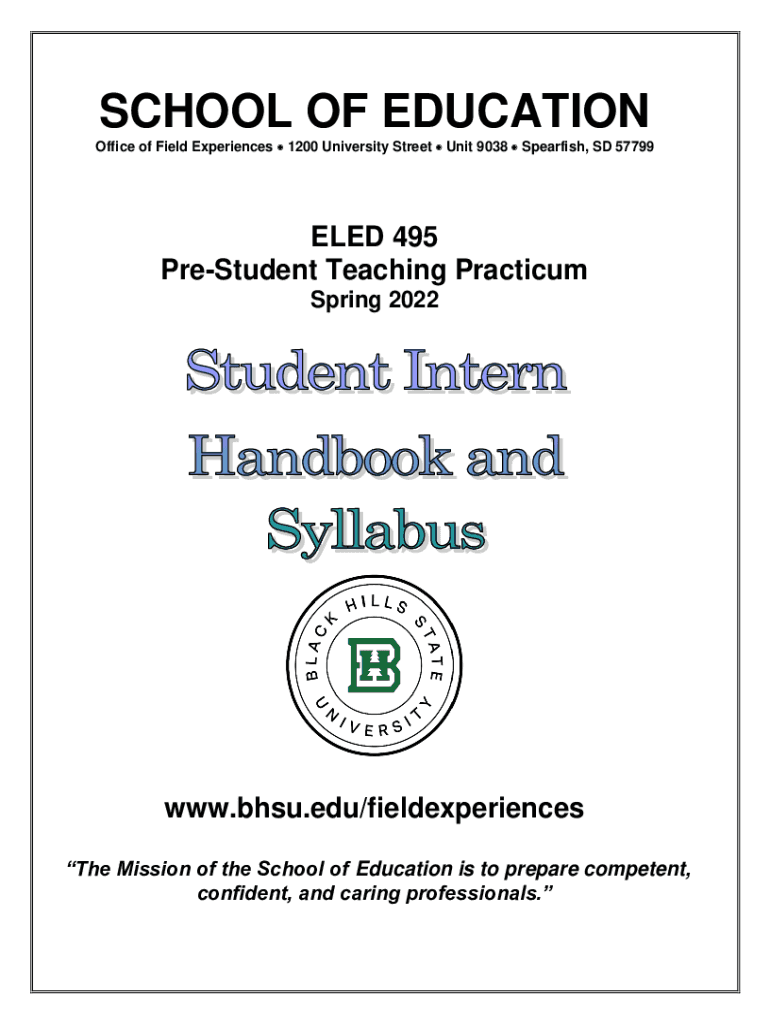 SCHOOL OF EDUCATION Office of Field Experiences 1200 University Street Unit 9038 Spearfish, SD 57799ELED 495 President Teaching Practicum Spring 2022www.bhsu.edu/fieldexperiences The Mission of the