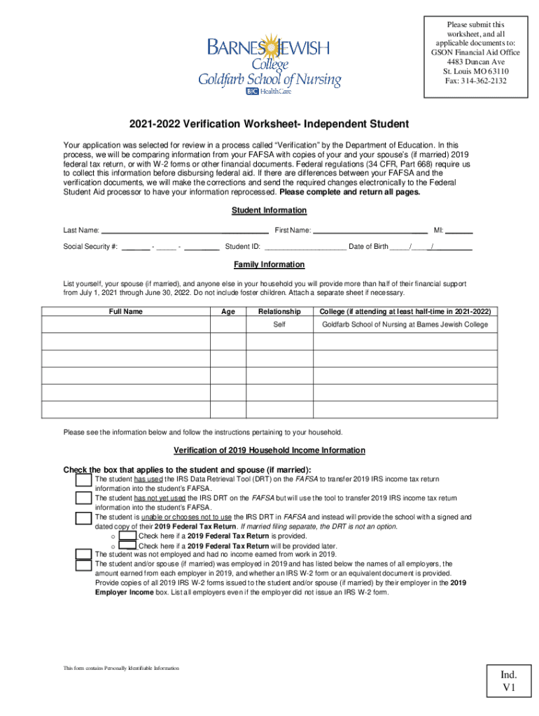 Please submit this worksheet, and all applicable documents to: SON Financial Aid Office 4483 Duncan Ave St. Louis MO 63110 Fax: 314362213220212022 Verification Worksheet Independent Student Your application