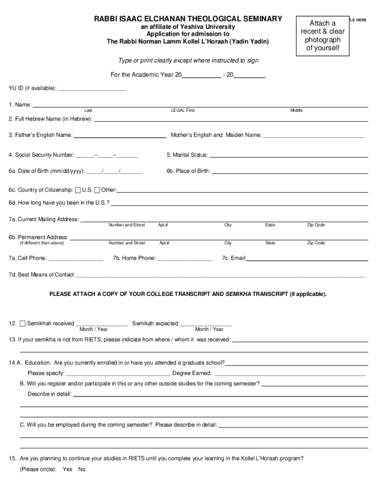 RABBI ISAAC BUCHANAN THEOLOGICAL SEMINARY an affiliate of Yeshiva University Application for admission to The Rabbi Norman Lamp Killed Whoreish (Ya din)STAPLE Reattach a recent & clear photograph