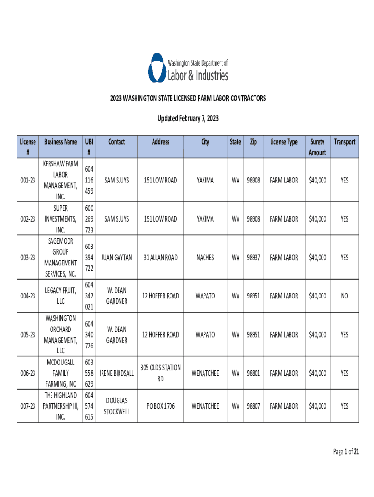 2023 WASHINGTON STATE LICENSED FARM LABOR CONTRACTORS Updated February 7, 2023, License # 001230022300323004230052300623 00723Business Name KEISHA FARM LABOR MANAGEMENT, INC. SUPER INVESTMENTS, INC.