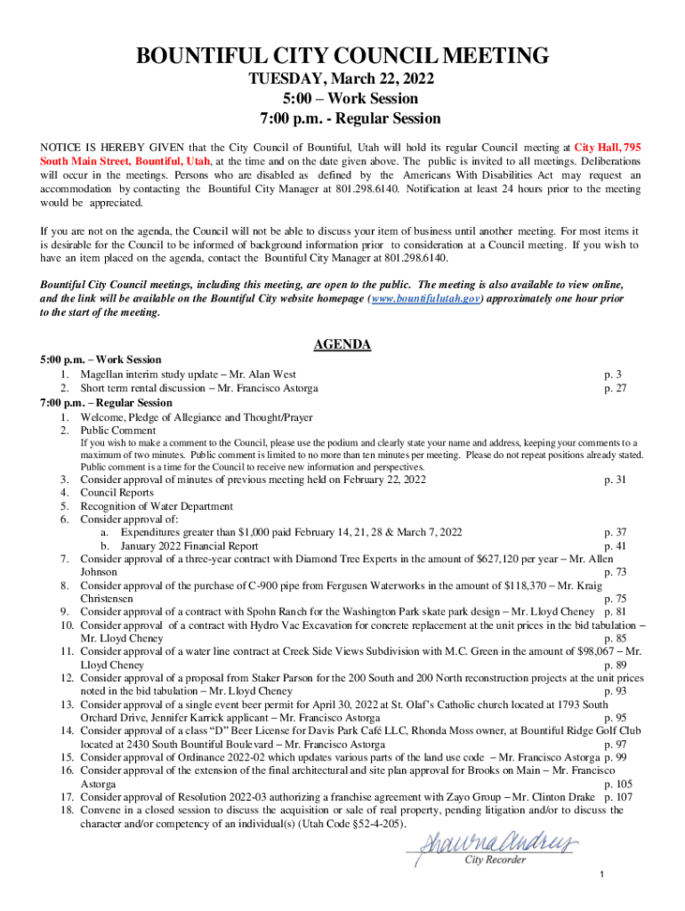 BOUNTIFUL CITY COUNCIL MEETING TUESDAY, March 22, 2022 5:00 Work Session 7:00 p.m. Regular Session NOTICE IS HEREBY GIVEN that the City Council of Bountiful, Utah will hold its regular Council meeting