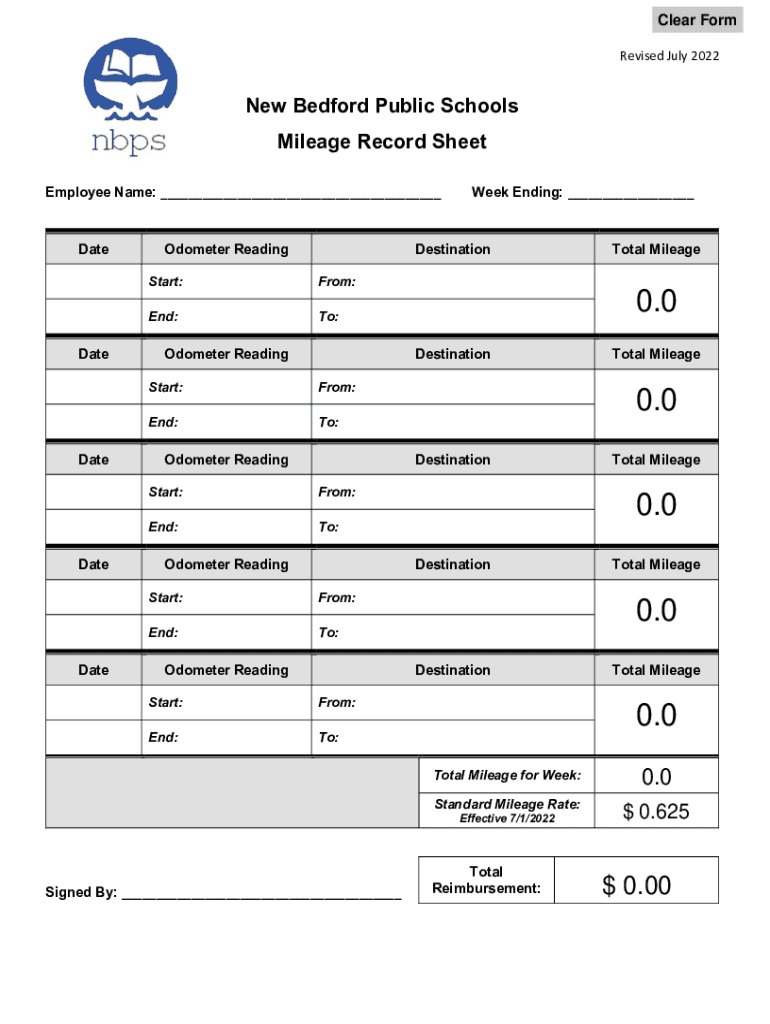 Clear Form Revised July 2022New Bedford Public Schools Mileage Record Sheet Employee Name: ___DateDateDateDateDateOdometer ReadingWeek Ending: ___Destination Start:From:End:To:Odometer Reading0.0