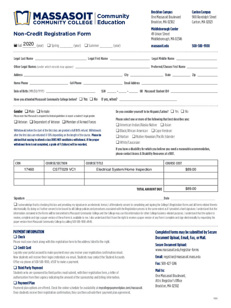 Brockton Campus Massasoit BoulevardBrockton, MA 02302Community Education Canton Campus 900 Randolph Street Canton, MA 02021NonCredit Registration FormMiddleborough Center 49 Union Street Middle borough,