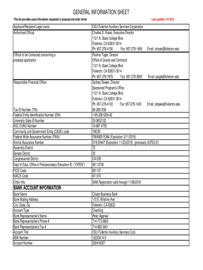 GENERAL INFORMATION SHEET This list provides usual information requested in proposal and other forms. Applicant/Recipient Legal name Authorized OfficialOfficial to be Contacted concerning a proposal