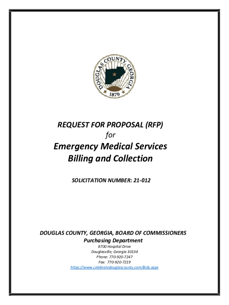 REQUEST FOR PROPOSAL (RFP) emergency Medical Services Billing and Collection SOLICITATION NUMBER: 21012DOUGLAS COUNTY, GEORGIA, BOARD OF COMMISSIONERS Purchasing Department 8700 Hospital Drive Douglasville,