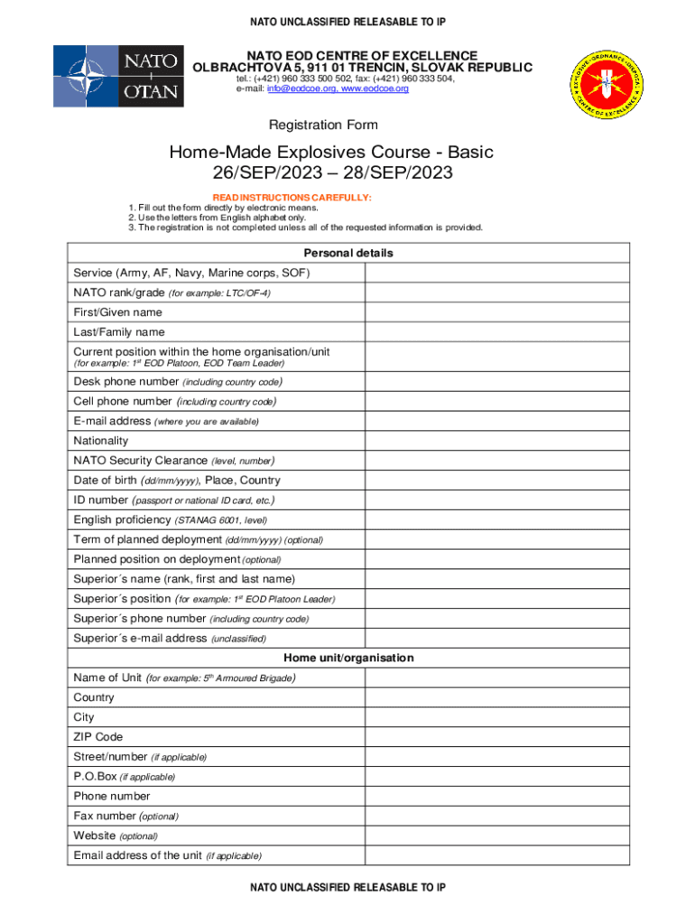 NATO UNCLASSIFIED RELEASABLE TO IP NATO EOD Center OF EXCELLENCE OLBRACHTOVA 5, 911 01 Trenches, SLOVAK REPUBLIC tel.: (+421) 960 333 500 502, fax: (+421) 960 333 504, email: info@eodcoe.org, www.eodcoe.orgRegistration