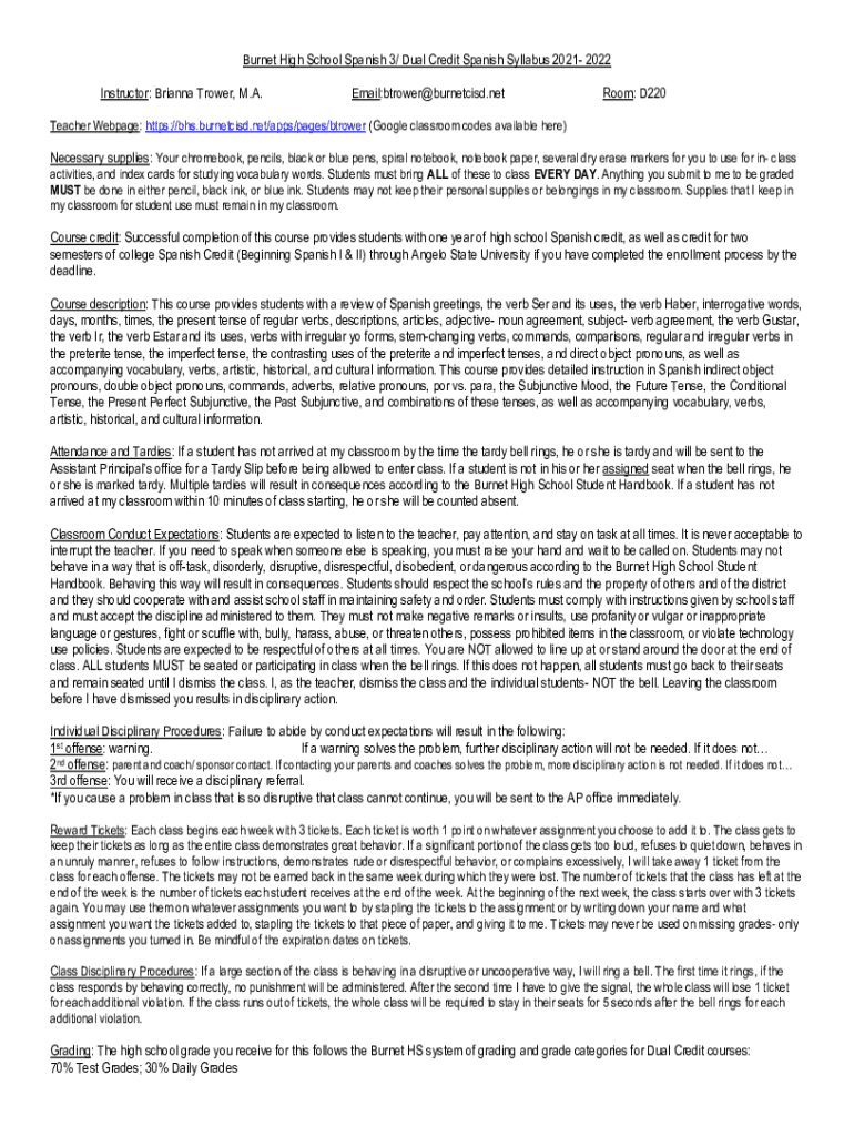Burned High School Spanish 3/ Dual Credit Spanish Syllabus 2021 2022 Instructor: Brianna Tower, M.A.Email:btrower@burnetcisd.bedroom: D220Teacher Webpage: https://bhs.burnetcisd.net/apps/pages/btrower