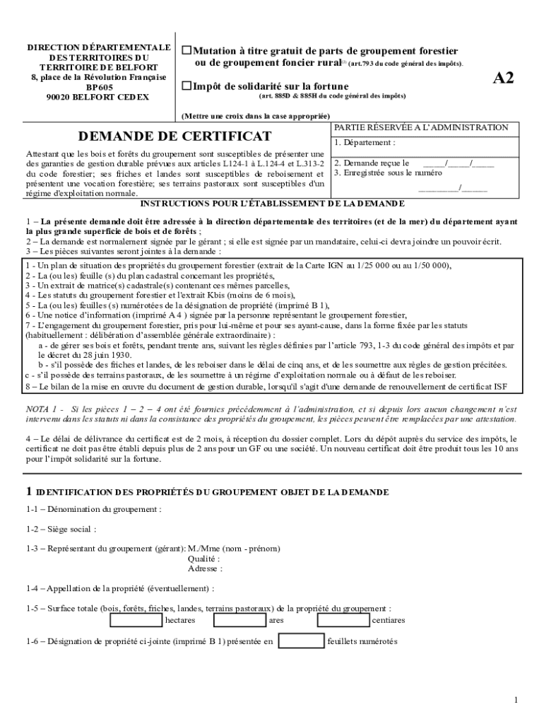 DIRECTION DEPARTMENTAL DES TERRITORIES DU TERRITORY DE BEFORE 8, place DE la Evolution Franchise BP 605 90020 BEFORE CEDEXMutation title gratuity DE parts DE procurement Forestier of DE procurement