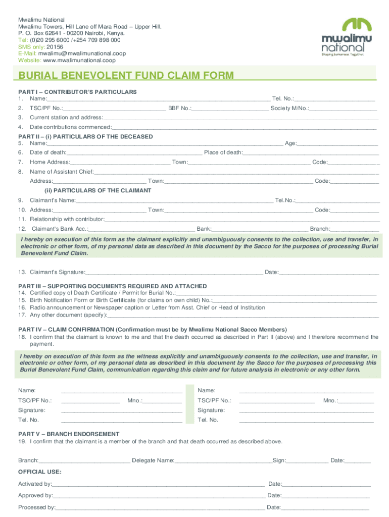 Get the free BURIAL BENEVOLENT FUND CLAIM FORM