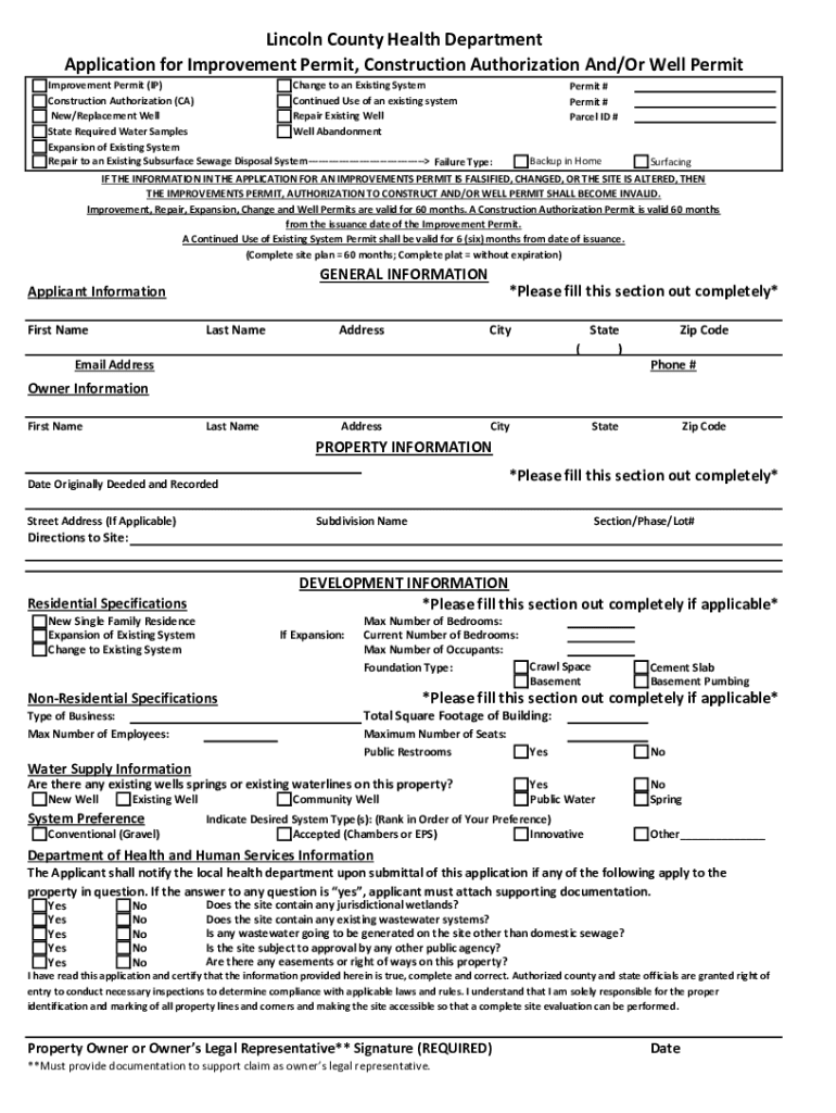 Lincoln County Health Department Application for Improvement Permit, Construction Authorization And/Or Well Permit Improvement Permit (IP) Change to an Existing System Construction Authorization (CA)