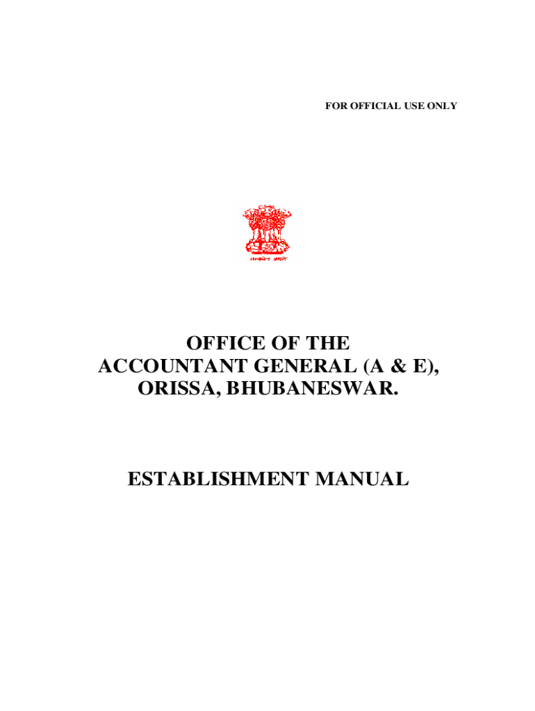 FOR OFFICIAL USE OpenOffice OF THE ACCOUNTANT GENERAL (A & E), ORI SSA, BHUBANESWAR.ESTABLISHMENT MANUAL ACCOUNTANT GENERAL(A&E), ORI SSA 2008FOR OFFICE USE ONLYPREFACEThis Manual has been compiled,