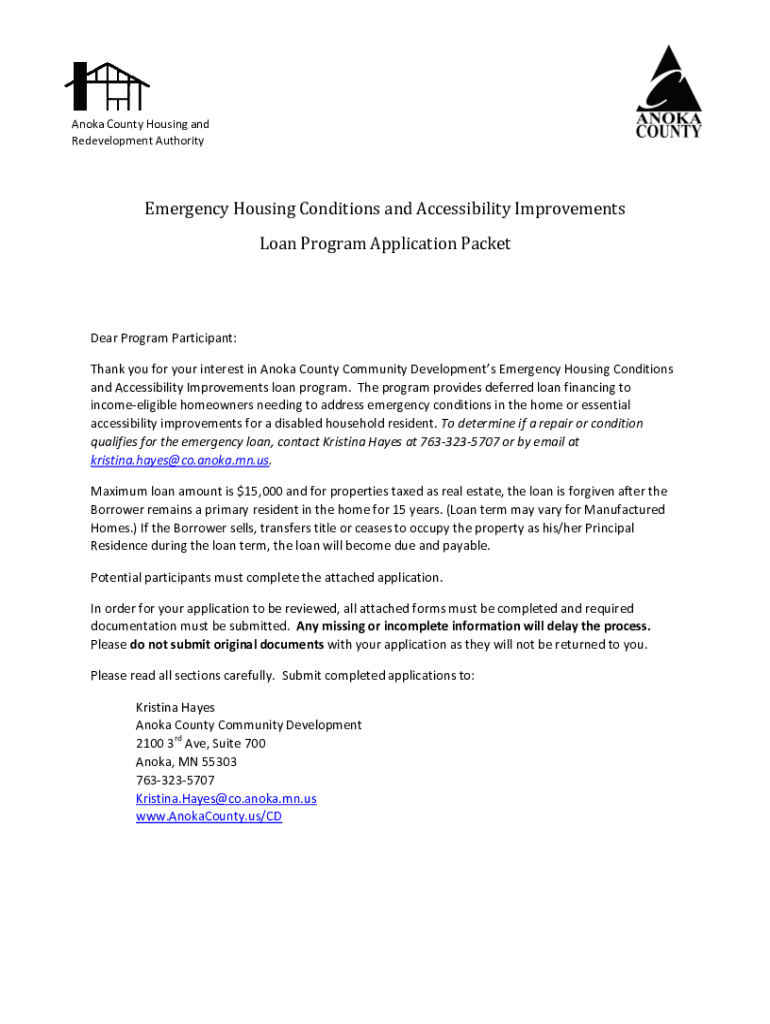 Anoka County Housing and Redevelopment AuthorityEmergency Housing Conditions and Accessibility Improvements Loan Program Application Racketeer Program Participant: Thank you for your interest in Anoka