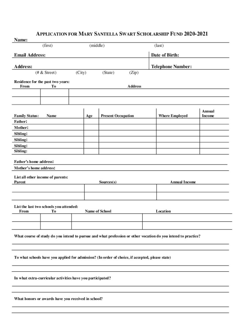 APPLICATION FOR MARY STELLA START SCHOLARSHIP FUND 20202021 Name: (first)(middle)(last)Email Address:Date of Birth:Address:Telephone Number: (# & Street)(City)(State)Residence for the past two years: