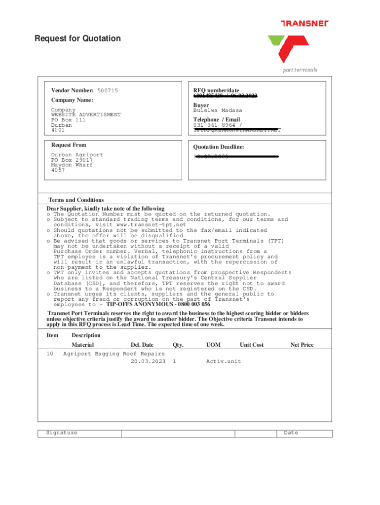 Request for QuotationVendor Number: 500715RFQ number/date 6001485439 / 06.03.2023Company Name:Buyer Bull MadasaCompany WEBSITE ADVERTISEMENT PO Box 111 Durban 4001Telephone / Email 031 361 8964 /