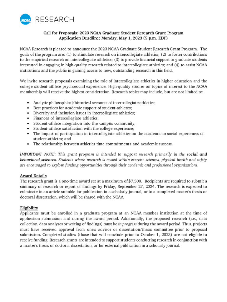 Call for Proposals: 2023 NCAA Graduate Student Research Grant Program Application Deadline: Monday, May 1, 2023:5 p.m. EDT) NCAA Research is pleased to announce the 2023 NCAA Graduate Student Research