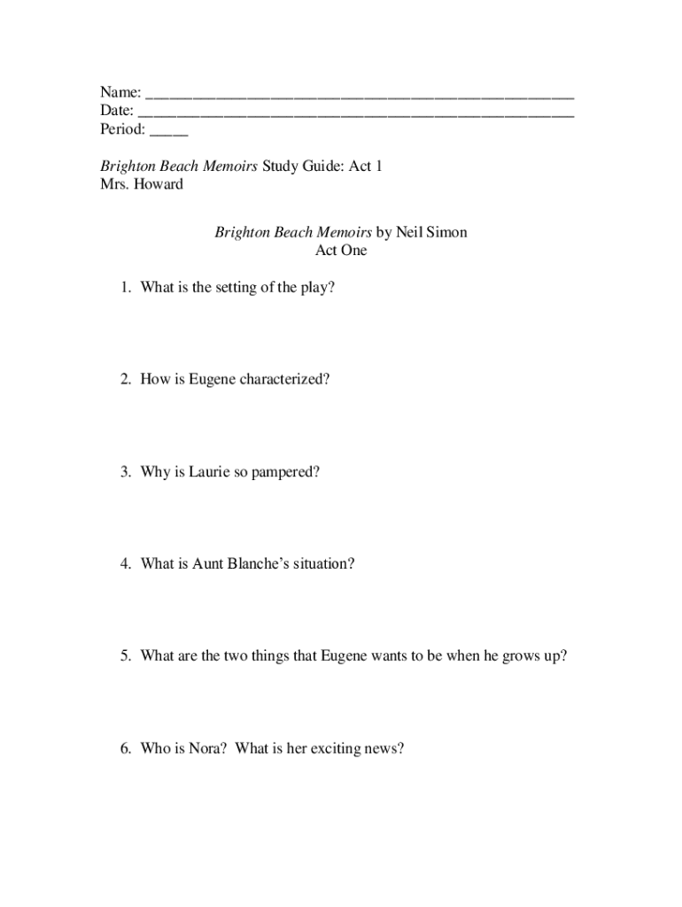 Name: ___ Date: ___ Period: ___ Brighton Beach Memoirs Study Guide: Act 1 Mrs. Howard Brighton Beach Memoirs by Neil Simon Act One 1. What is the setting of the play?2. How is Eugene characterized?3.