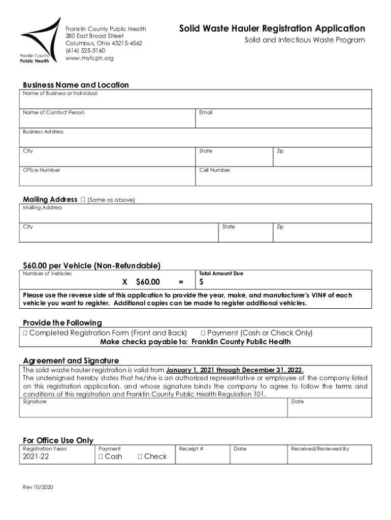 Franklin CountyPublic Health Franklin County Public Health 280 East Broad Street Columbus, Ohio 432154562 (614) 5253160 www.myfcph.orgSolid Waste Hauler Registration Application Solid and Infectious