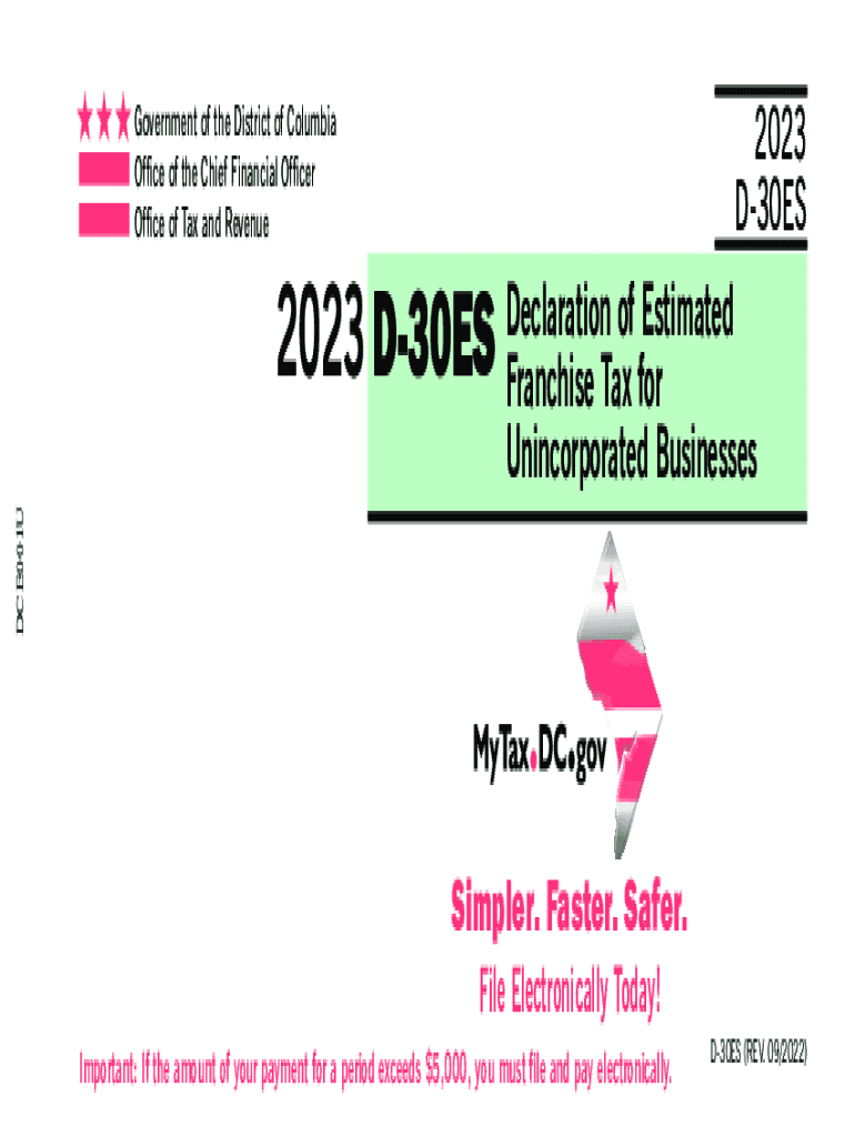 2023 D30ESGovernment of the District of Columbia Office of the Chief Financial Officer Office of Tax and Revenue of Estimated 2023 D30ES Declaration Franchise Tax for DCE001UUnincorporated BusinessesSimpler.