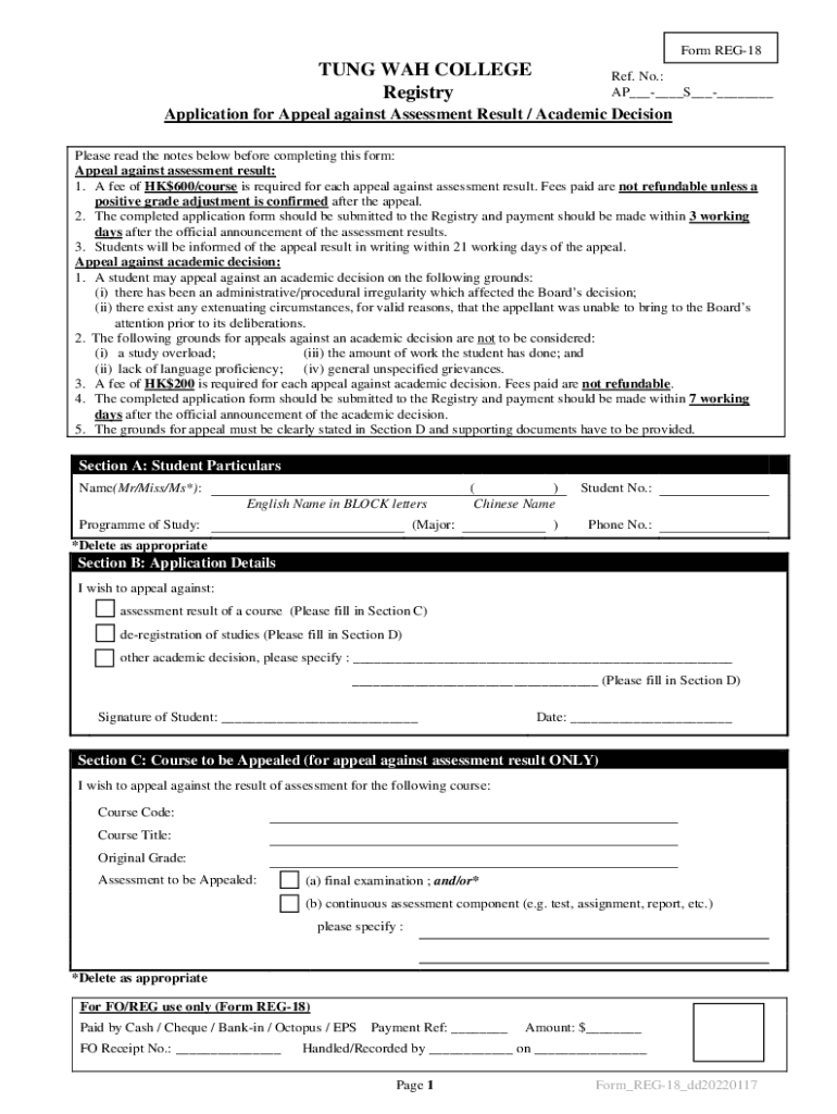 Form REG18TUNG WAS COLLEGE Registered. No.: AP______S______Application for Appeal against Assessment Result / Academic Decision Please read the notes below before completing this form: Appeal against