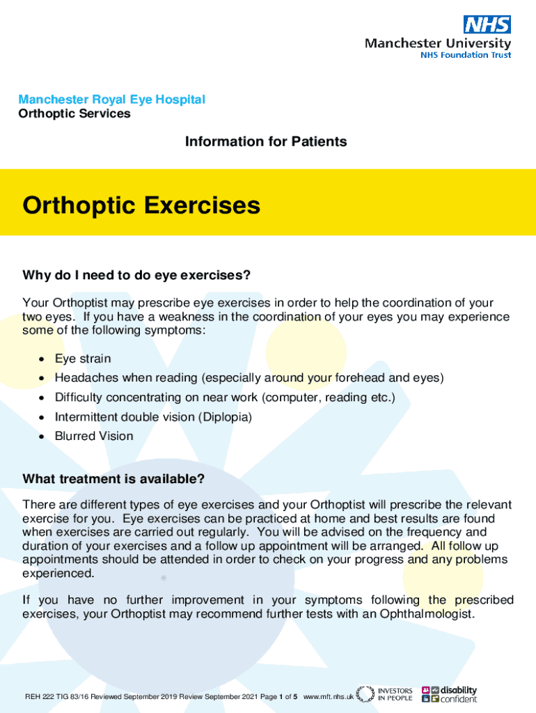 Manchester Royal Eye Hospital Orthotic ServicesInformation for PatientsOrthoptic Exercises Why do I need to do eye exercises? Your Orthopedist may prescribe eye exercises in order to help the coordination