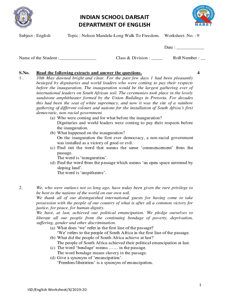 INDIAN SCHOOL PARFAIT DEPARTMENT OF ENGLISH Subject : EnglishTopic : Nelson Mandela Long Walk To Freedom. Worksheet. No. 9 Date : ___Name of the Student :___Class & Division : ___Roll Number : __S.