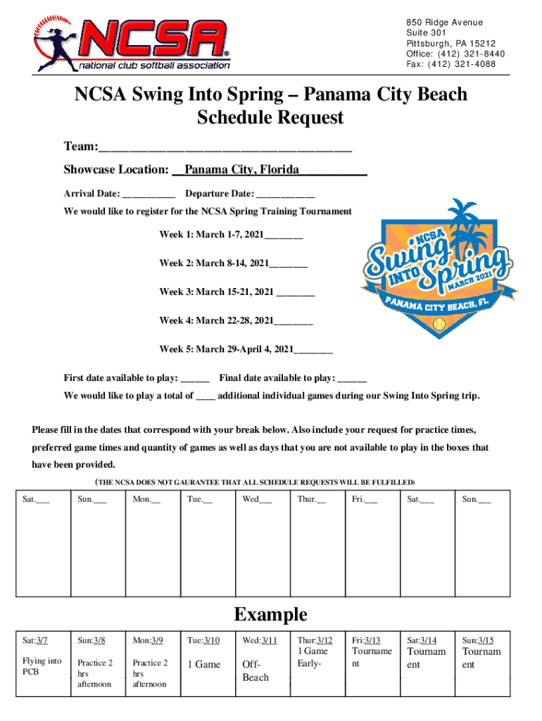 850 Ridge Avenue Suite 301 Pittsburgh, PA 15212 Office: (412) 3218440 Fax: (412) 3214088NCSA Swing Into Spring Panama City Beach Schedule Request Team:___ Showcase Location: __Panama City, Florida___