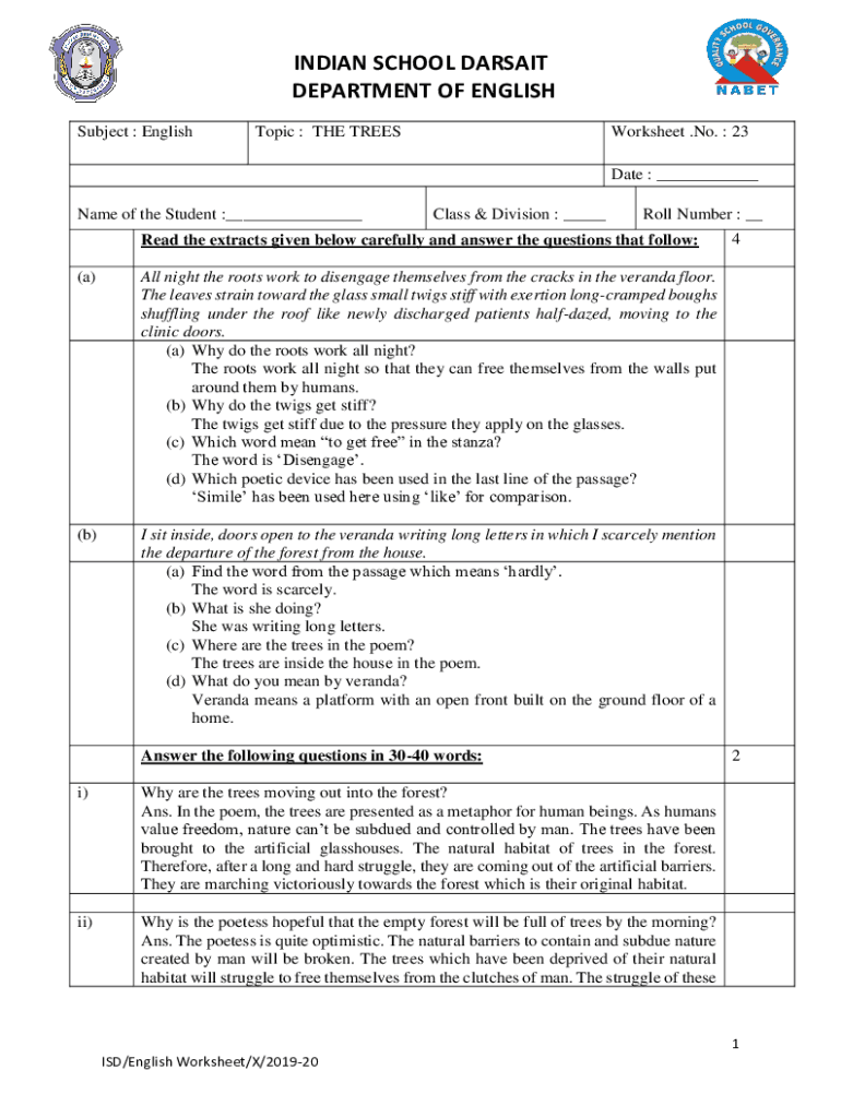 Subject : EnglishTopic : THE TREESWorksheet. No. 23