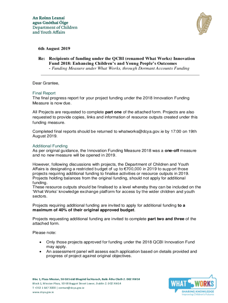 6th August 2019 Re: Recipients of funding under the CBI (renamed What Works) Innovation Fund 2018: Enhancing Children's and Young Peoples Outcomes Funding Measure under What Works, through Dormant