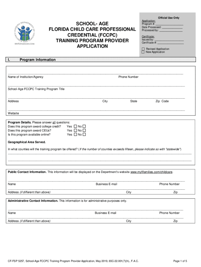 SCHOOL AGE FLORIDA CHILD CARE PROFESSIONAL CREDENTIAL (CCPC) TRAINING PROGRAM PROVIDER APPLICATION I. Official Use Only Application: Program #: ___ Date Processed: ___ Processed by: ___ Certificate: