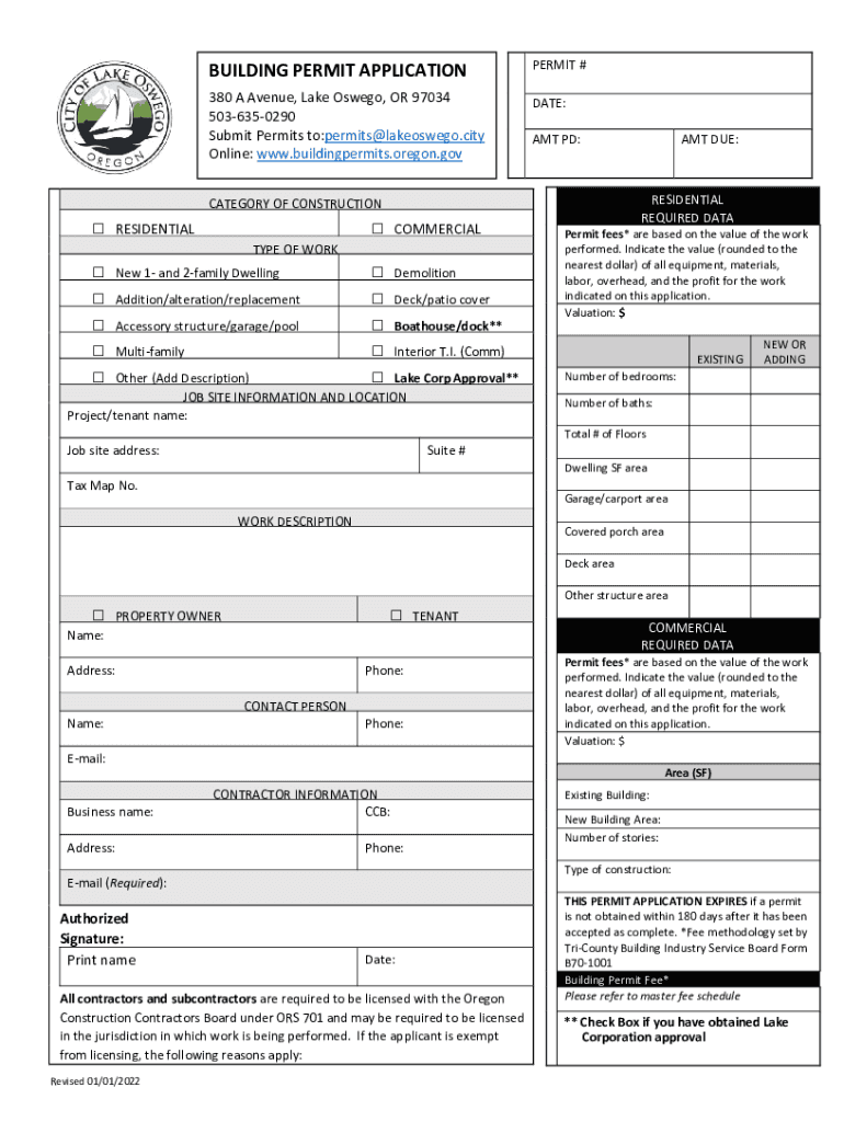 New Residential Construction Building Permit Applications to be submitted online at: https://acaoregon.accela.com/oregon/ Or by email to: Permits@lakeoswego.city Step 1 Tree Removal/Protection: o