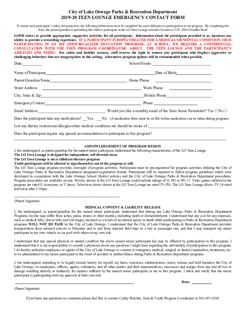 City of Lake Oswego Parks & Recreation Department 201920 TEEN LOUNGE EMERGENCY CONTACT FORM To insure each participant's safety and protection, the following information must be completed for each