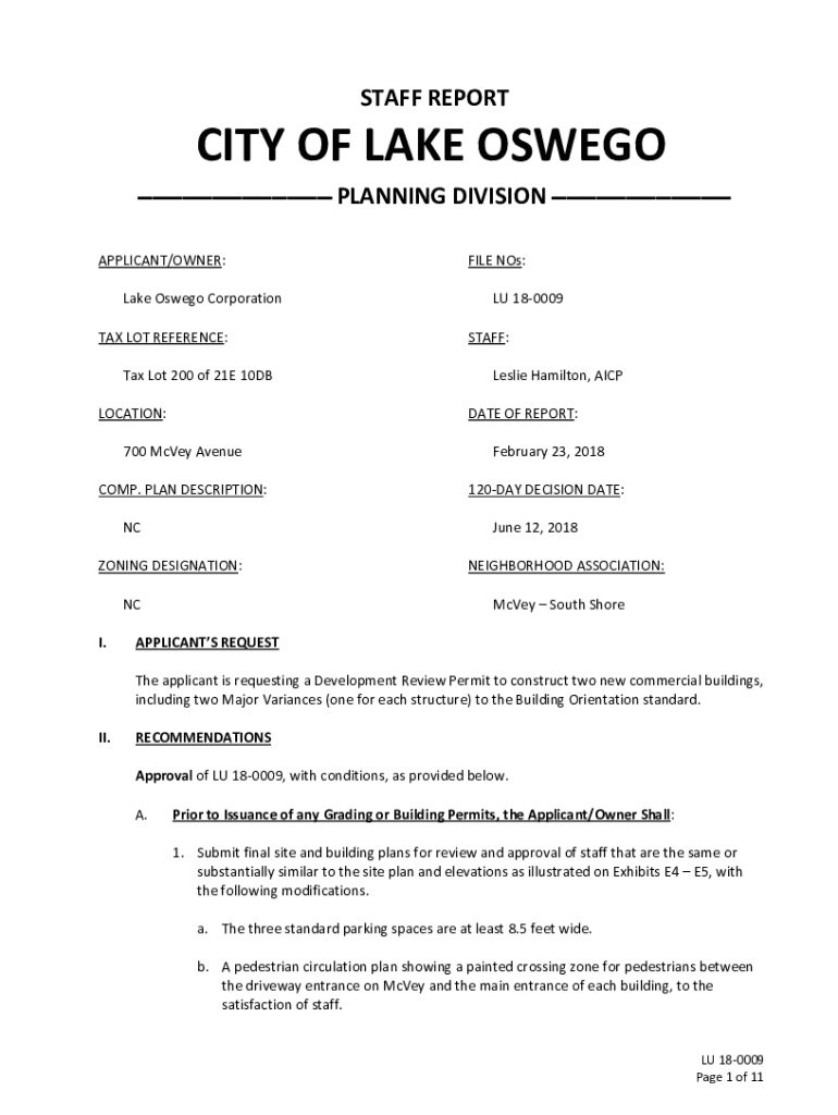 STAFF REPORTEDLY OF LAKE OSWEGO___ PLANNING DIVISION ___ APPLICANT/OWNER: Lake Oswego Corporation TAX LOT REFERENCE: Tax Lot 200 of 21E 10DB LOCATION:FILE Nos: LU 180009 STAFF: Leslie Hamilton, ICP