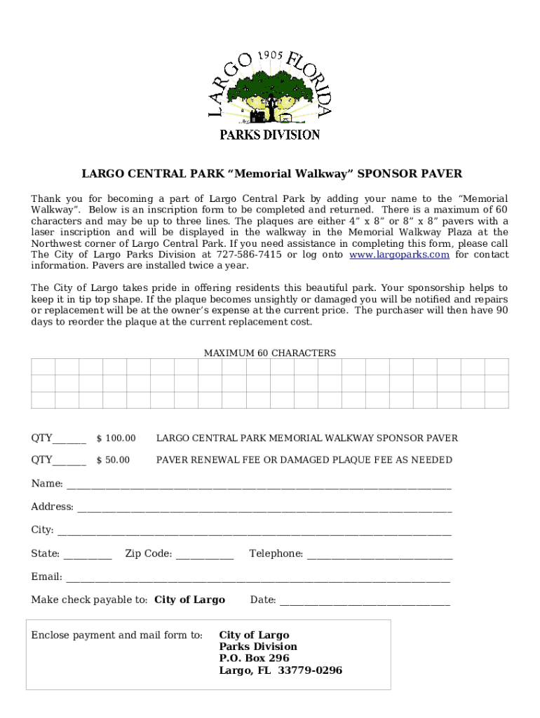 LARGO CENTRAL PARK Memorial Walkway SPONSOR PAVER Thank you for becoming a part of Largo Central Park by adding your name to the Memorial Walkway. Below is an inscription form to be completed and