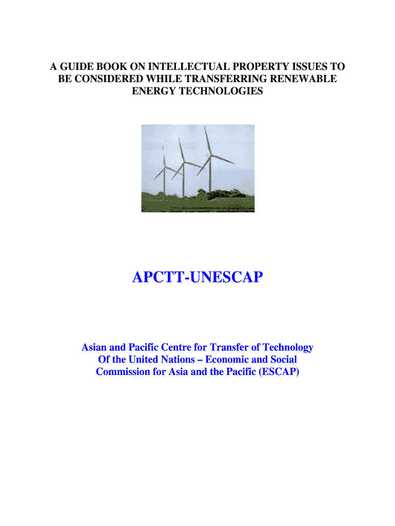 A GUIDE BOOK ON INTELLECTUAL PROPERTY ISSUES TO BE CONSIDERED WHILE TRANSFERRING RENEWABLE ENERGY TECHNOLOGIES APCTTUNESCAP Asian and Pacific Center for Transfer of Technology Of the United Nations