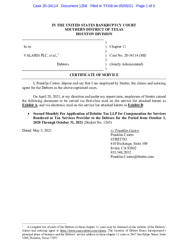 Case 2034114 Document 1258 Filed in TSB on 05/05/21-Page 1 of 5IN THE UNITED STATES BANKRUPTCY COURT SOUTHERN DISTRICT OF TEXAS HOUSTON DIVISION In re: VALARIE PLC, et al.,1 Debtors.) ) Chapter 11))
