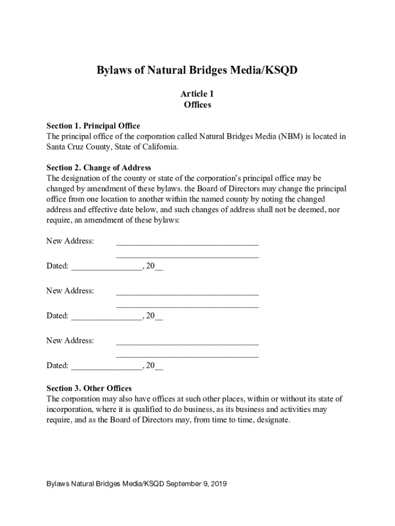 Bylaws of Natural Bridges Media/USED Article 1 Offices Section 1. Principal Office The principal office of the corporation called Natural Bridges Media (IBM) is located in Santa Cruz County, State