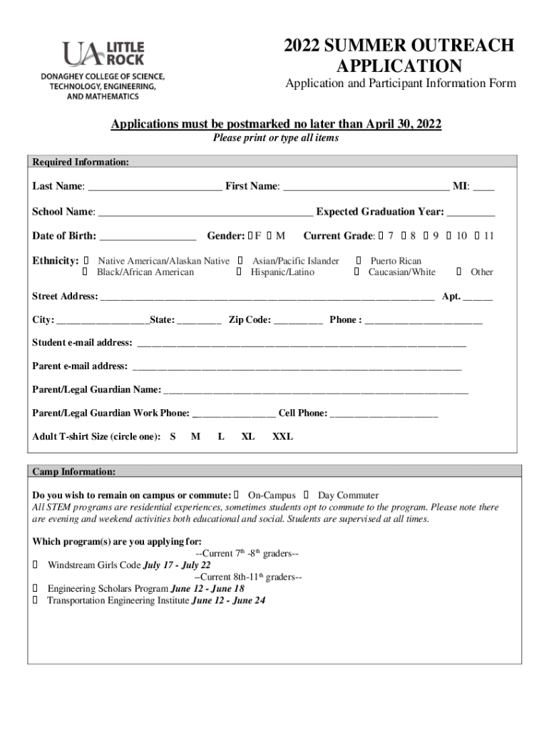 2022 SUMMER OUTREACH APPLICATION and Participant Information Form Applications must be postmarked no later than April 30, 2022, Please print or type all items Required Information:Last Name: ___ First